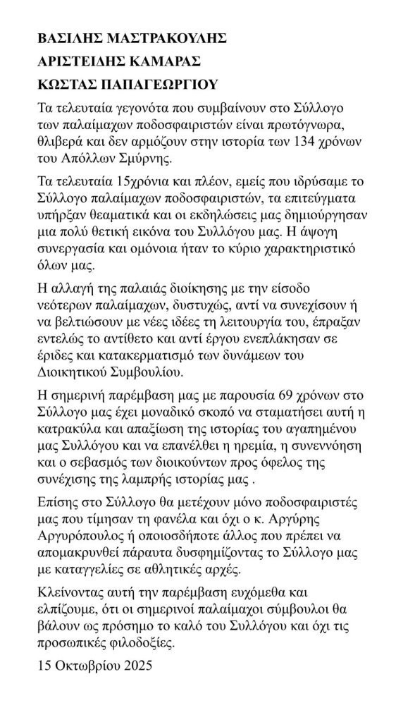 Έχουμε κατ’ επανάληψη τονίσει πως η εξαφάνιση του ιστορικού Απόλλωνα Σμύρνης από τον ποδοσφαιρικό χάρτη και ο εξευτελισμός του με την κατρακύλα στα τοπικά της Αθήνας δεν είναι τυχαία… Η πάλαι ποτέ μεγάλη «Ελαφρά Ταξιαρχία» διανύει τα πιο μελανά χρόνια ανυποληψίας και την Τετάρτη (15/10/2025) υπήρξε ακόμα μία απόδειξη της σήψης που υπάρχει στην ομάδα και το σύλλογο γενικότερα.